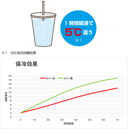 カップに冷水入れ、ストレッチカップスリーブ使用した場合と使用しない場合の水温経過を比較すると
