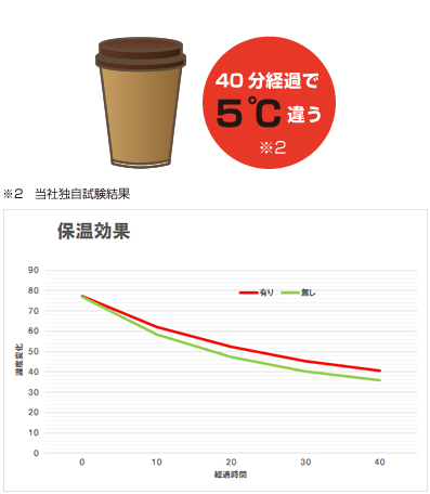 カップに温水入れ、ストレッチカップスリーブ使用した場合と使用しない場合の水温経過を比較すると